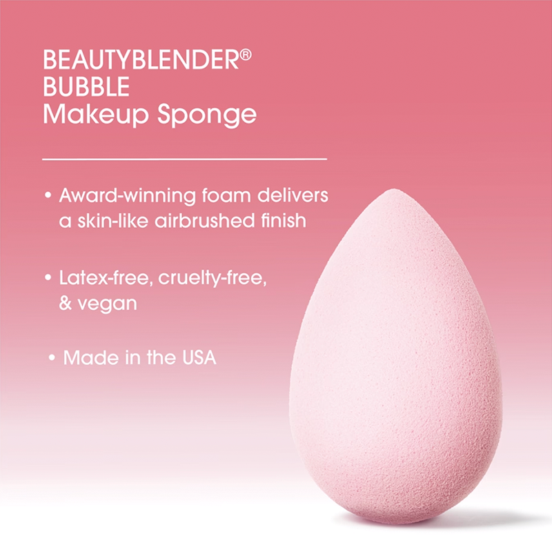 Beautyblender Bubble merupakan aplikator spons berwarna pink muda yang lembut dengan bahan material latex free sponge, yang dirancang dengan sisi bundar untuk hasil yang presisi. Dapat digunakan untuk mengaplikasikan produk cair atau krim seperti foundation, cream blush dan primer, digunaka dengan cara di basahi air.