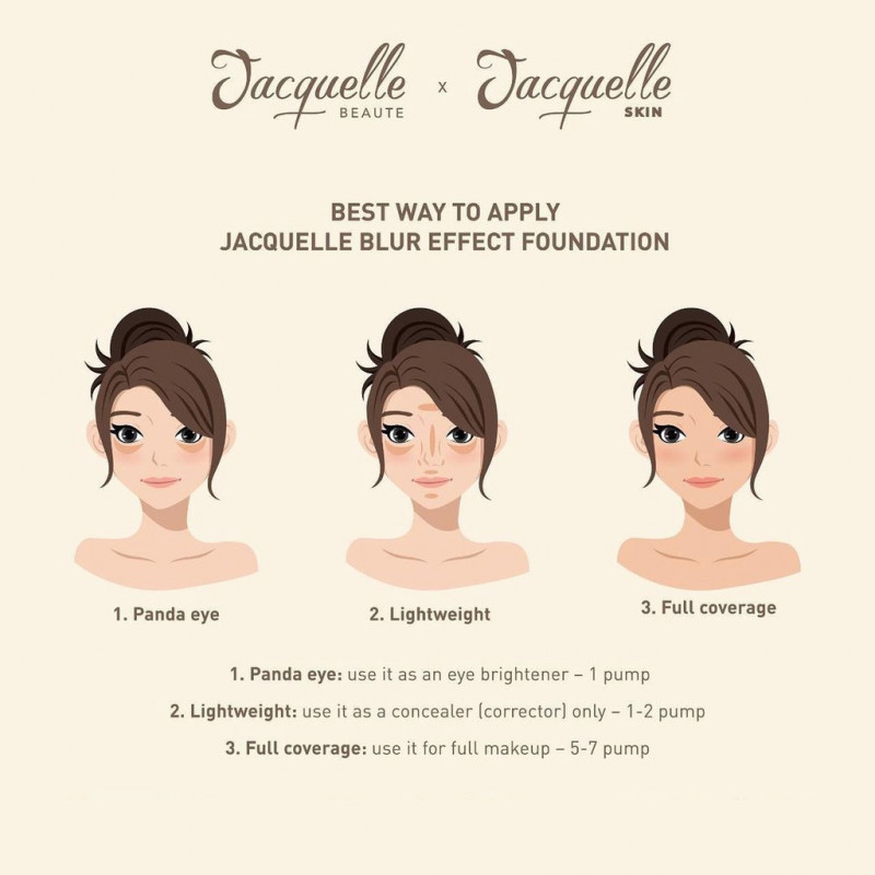 Jacquelle Blur Effect Foundation is a long lasting foundation that’ll conceals your pores with satin finish. It makes your skin look more healthy and make your face look more flawless for a natural makeup look. It also contains sun protection to protect your skin, not to mention it also contains niacinamide that has so many benefits to our skin such as help to protect our skin from acne, help create a more uniform skin tone and many more! Imagine a makeup product that also taking care of our skin. How cool is that! It's contains 2% Niacinamide helps to protect skin from acne and control oily skin, UV Protection, and Allantoine & Caffeine for soothe and calm skin from dullness