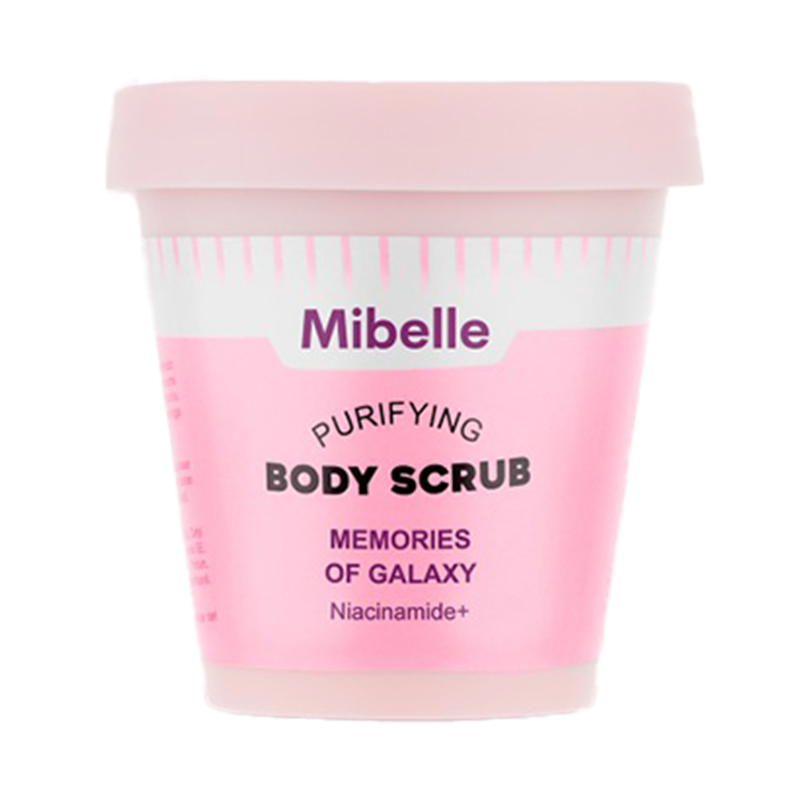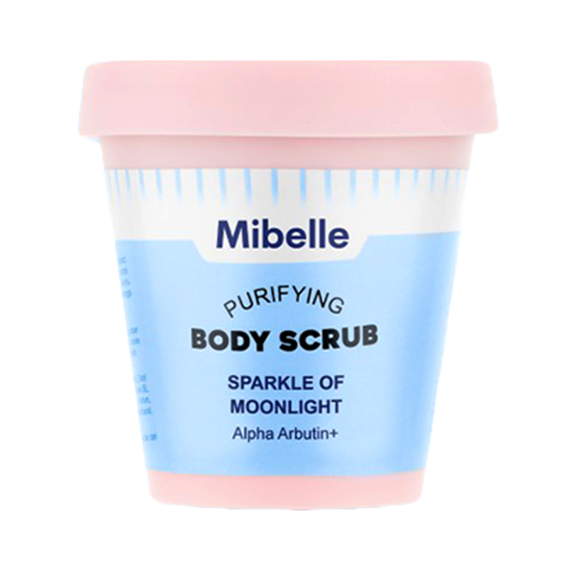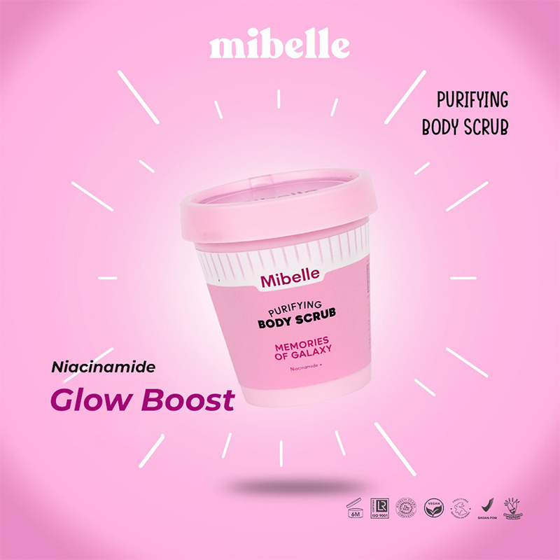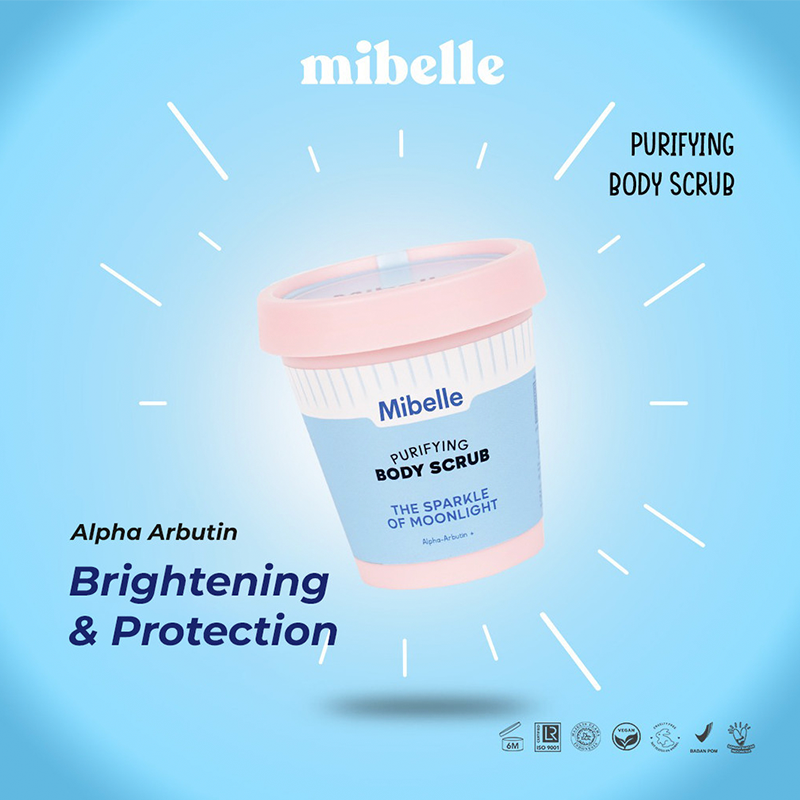 Mibelle Body Scrub Scrub yang dapat membantu mengangkat sel-sel kulit mati dan mencerahkan kulit, Cruelty Free, Vegan, BPOM Approved.