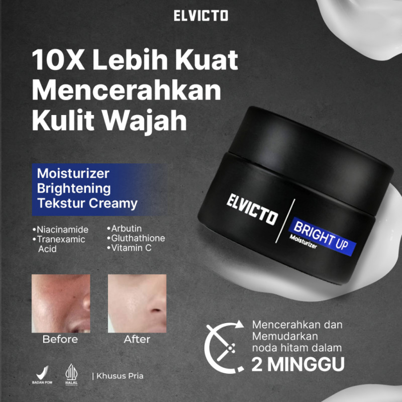 CARA PAKAI : Oleskan ELVICTO Bright Up Moisturizer pada siang dan malam secara tipis dan merata pada wajah yang sudah dibersihkan.
