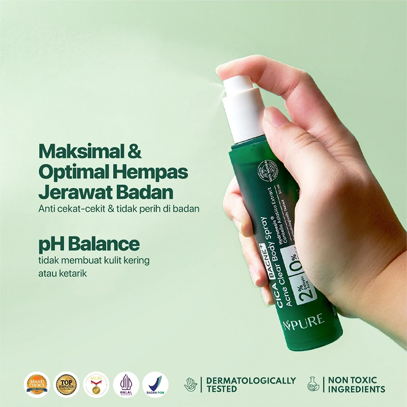 Acne body spray yang membantu mengatasi & mencegah terbentuknya jerawat badan, membersihkan pori-pori, dan memberikan efek soothing ke kulit.