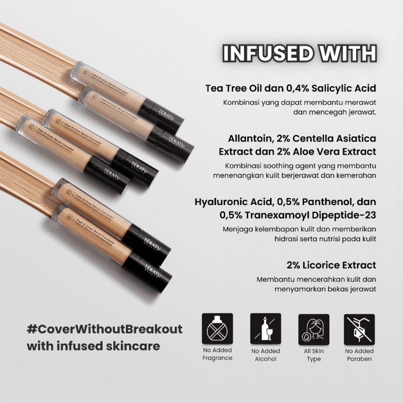 CLEAR & COVER SERUM CONCEALER adalah lightweight concealer dengan medium to full coverage, no creasing, blendable, dan memiliki kemampuan oil control yang cocok untuk semua jenis kulit termasuk kulit sensitif & berjerawat. Concealer ini membantu menyamarkan tampilan noda bekas jerawat, flek, dark circle, kemerahan pada wajah dan juga membantu meratakan warna kulit yang tidak merata. Diperkaya dengan skincare benefit yang membantu merawat kulit berjerawat. Menghasilkan makeup dengan tampilan yang semi matte finish dan long lasting.