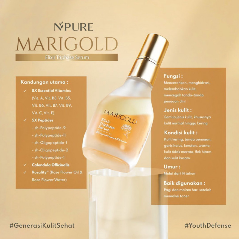 Serum triphase dengan kombinasi Ekstrak Marigold, 8X Essential Vitamins, dan 5X Peptides untuk merawat kulit agar tampak lebih kenyal, halus, dan lembut. Diperkaya dengan Rose Flower Oil & Rose Flower Water untuk membantu mengurangi tanda-tanda kelelahan kulit sehingga kulit tampak lebih sehat bercahaya dan segar.