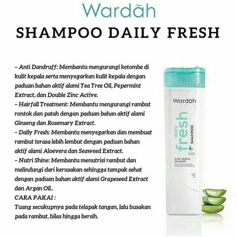 Wardah Daily Fresh Shampoo, Mengandung ScentLock Fragrance™ Dengan wangi lebih tahan lama bahkan hingga pemakaian berikutnya, jadikan rambut terasa lebih segar dan harum sepanjang hari. Dengan paduan bahan aktif natural yang bekerja multiaksi. Aloe Vera Extract bantu menyegarkan, Seaweed Extract yang terkenal menutrisi rambut, serta Wheat Protein bantu membuat rambut terasa lebih lembut.
