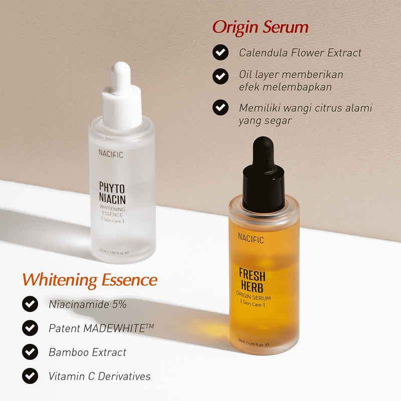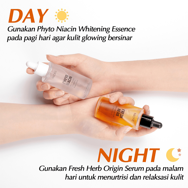 Paket kulit cerah & glowing! Sudah termasuk Phyto Niacin Whitening Essence yang ringan, menyegarkan, menghidrasi, dan mencerahkan kulit pada pagi hari dan Fresh Herb Origin Serum yang menutrisi kulit lelah pada malam hari. Paket terdiri dari:
