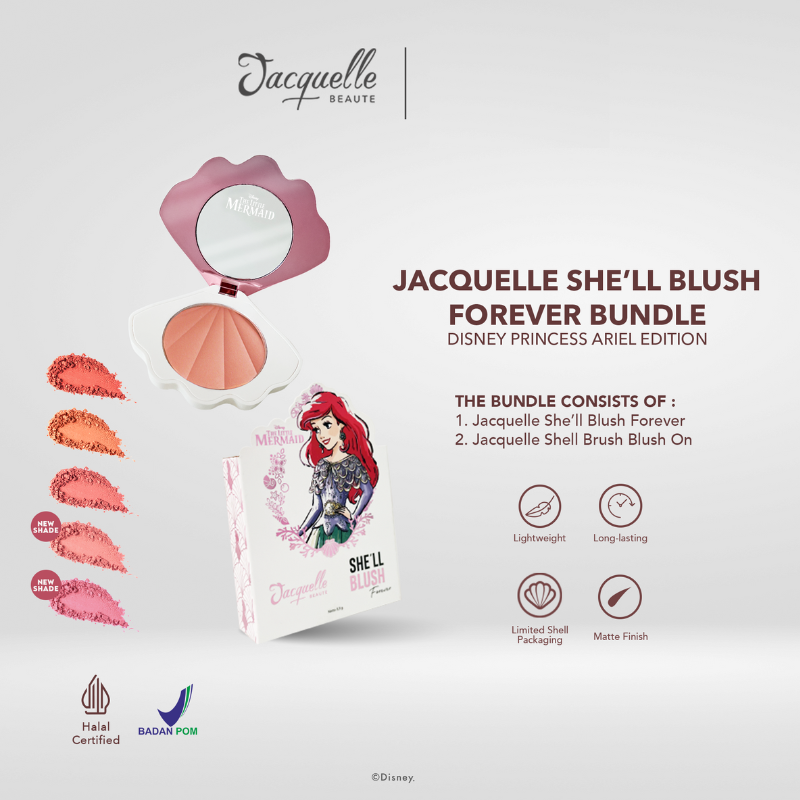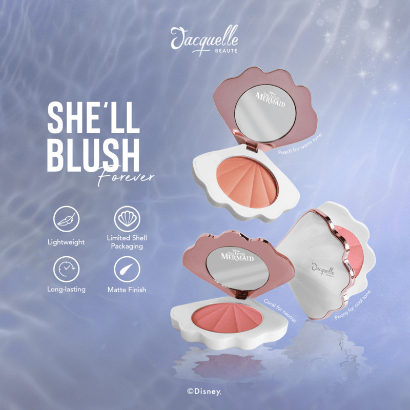 Let us be part of your world dengan Jacquelle She’ll Blush Forever! Pressed powder blush dengan hasil akhir matte. Memiliki formulasi yang lembut, ringan, dan mudah digunakan. Inovasi baru dengan kemasan berbentuk kerang yang compact, cocok untuk dibawa saat bepergian. Siap membuatmu merona seperti mermaid yang sedang jatuh cinta!