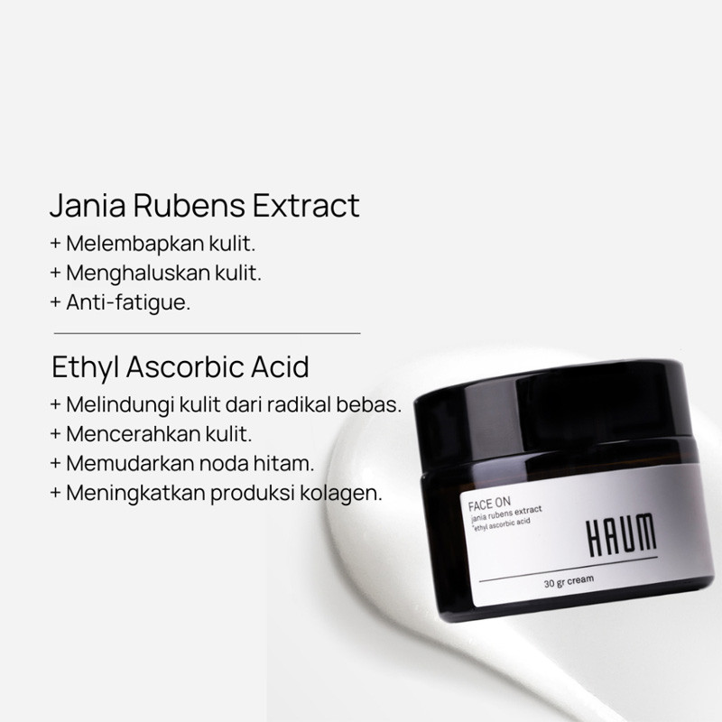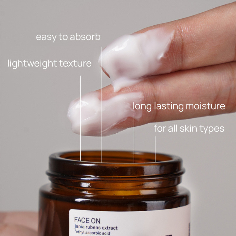 Moisturizer dengan bahan aktif Jania Rubens Extract, Ethyl Ascorbic Acid, Shea Butter, untuk membantu melembapkan, mencerahkan, melembutkan dan menyamarkan garis halus serta kerutan pada wajah. Mengandung UV filter.