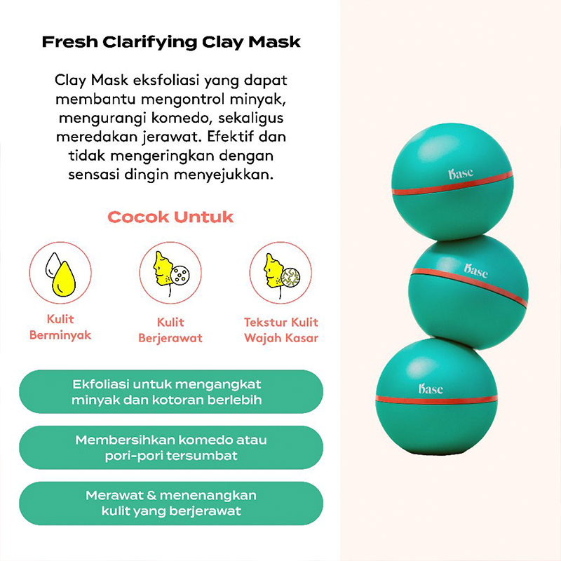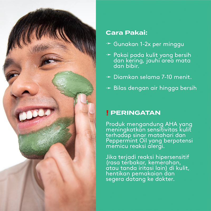 Clay mask eksfoliasi serba bisa: membersihkan pori-pori, mengontrol minyak, sekaligus membantu merawat kulit berjerawat. Efektif dan tidak mengeringkan dengan sensasi dingin menyegarkan.