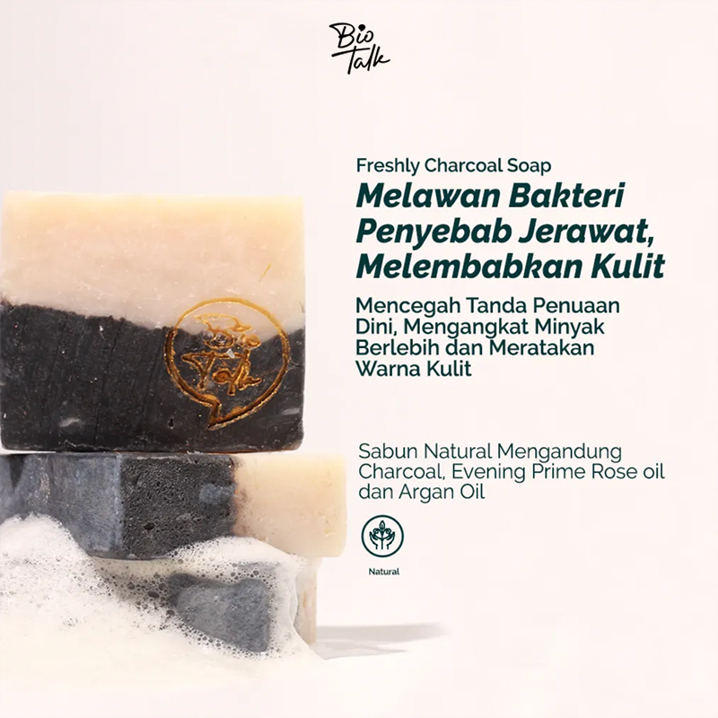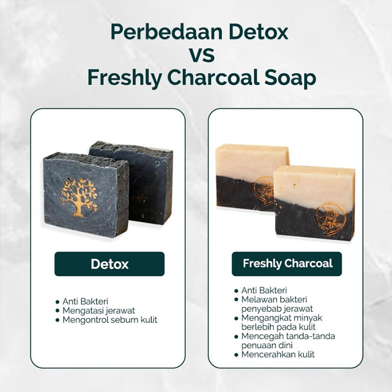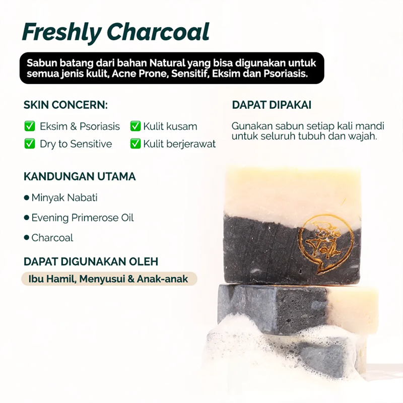 Freshly Charcoal Soap Highlights ingredients : Charcoal , Evening Prime Rose oil & Argan Oil Manfaat : - Membantu mengatasi masalah kulit berjerawat - Mencegah timbulnya jerawa - mencerahkan kulit wajah - menutrisi serta melembabkan kulit - Dapat digunakan pada wajah dan badan.