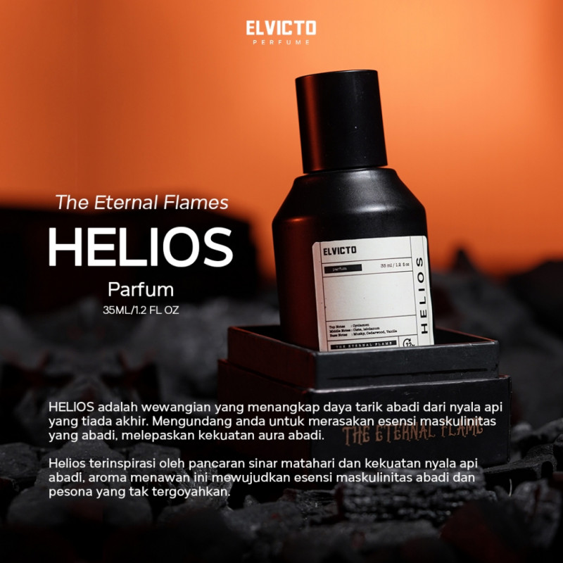 HELIOS adalah parfum yang menangkap api keabadian yang membara dan tak kunjung padam. Parfum Ini mengundang anda untuk merangkul esensi maskulinitas serta melepaskan kekuatan aura yang abadi. Komposisi keseluruhan varian "Helios" ini menggabungkan elemen bunga, pohon pinus, dan kayu-kayuan yang menawarkan aroma seperti layaknya api semangat yang membara dan pesona abadi serta mewakili energi dan kekuatan matahari yang terpancar sesuai dari karakter varian HELIOS.