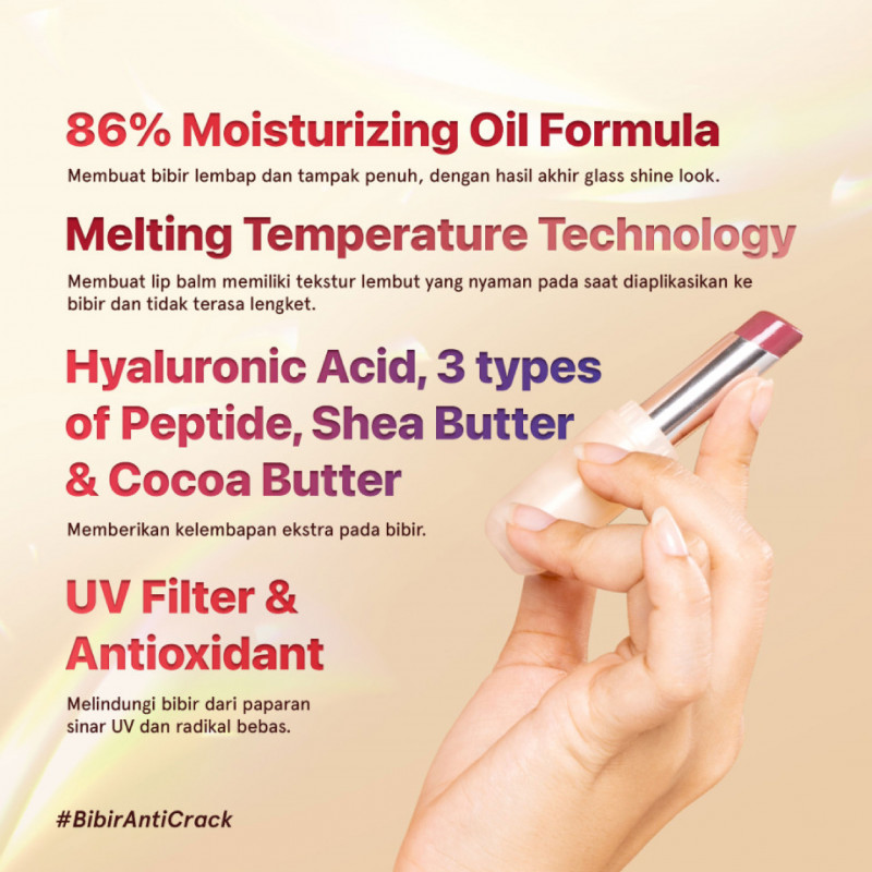 Dilengkapi dengan 86% moisturizing oil formula untuk bibir tampak lembap dan penuh, memberikan efek glass