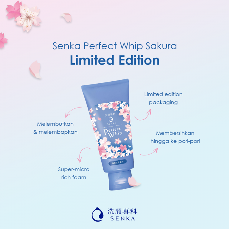 Setelah menjadi facial foam No.1 di Jepang selama 11 tahun berturut-turut, Senka mengeluarkan Perfect Whip Sakura Limited Edition di Indonesia untuk berikan pengalaman mencuci muka lebih menyenangkan. Busanya yang lembut, padat, dan berlimpah mampu bersihkan kotoran dan sisa make-up di segala jenis kulit. Diperkaya dengan Double Hyaluronic Acid yang jaga wajah tetap lembab setelah mencuci muka.