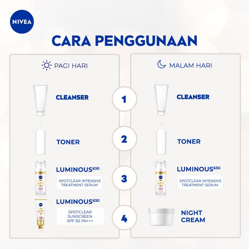 Cara penggunaan: 1. Gunakan pada wajah yang sudah bersih pada pagi dan malam hari 2. Aplikasikan secara merata, hindari kontak dengan mata 3. Untuk hasil yang optimal, gunakan NIVEA Luminous 630 Spotclear Sun Protect SPF 50 Pa+++ 40ml pada pagi hari.