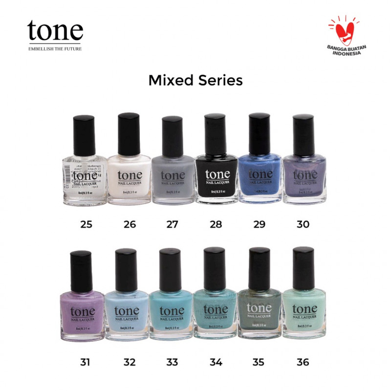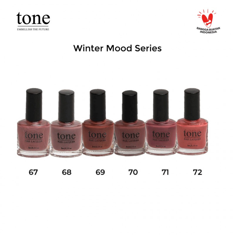 Tone Nail Lacquer, cat kuku yang menyediakan berbagai varian warna yang fashionable. Hasil pulasan tidak menggumpal, nyaman dan aman bagi kuku.