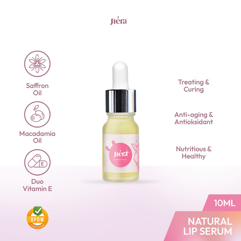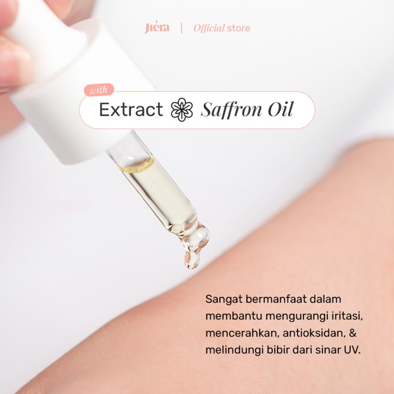 Jiera Natural Lip Serum terbuat dari kombinasi Olive Oil dan Macadamia Oil sebagai duo pelembap alami yang menjaga kelembapan kulit bibir dan mencegah bibir pecah-pecah. Diperkaya dengan Vitamin E yang menutrisi dan menjaga kesehatan kulit bibir. Saffron Oil sebagai antioxidant yang dapat melindungi bibir dari kerusakan akibat radikal bebas.