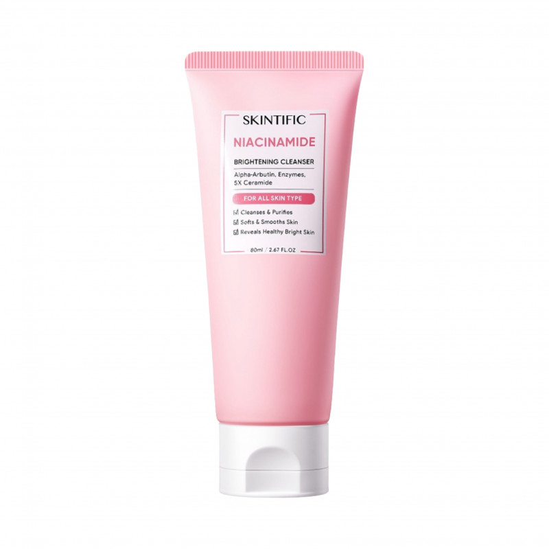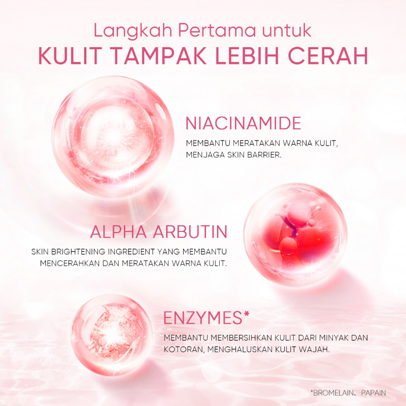 Niacinamide Brightening Cleanser dengan tekstur yang padat namun lembut, dapat membuat busa dengan mudah dan kaya. Diformulasikan dengan Niacinamide, Alpha Arbutin, dan Enzyme, menjadikan kulit tampak lebih cerah dan halus, serta membersihkan secara menyeluruh sekaligus mengontrol produksi minyak berlebih. Enzyme dari Lactobacillus Ferment Lysate, Bromelain dan Papain, mengembalikan kesegaran dan menyehatkan kulit. Diperkaya dengan 5X Ceramide, menjaga kelembaban kulit dan merawat skin barrier. Dikhususkan untuk mencerahkan kulit, menjadikan kulit tampak lebih bersinar dengan daya bersih yang kuat