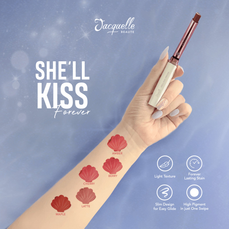Look at this stuff! This is Jacquelle She’ll Kiss Forever! produk ini merupakan lipstik dengan hasil akhir creamy matte yang hadir dengan kemasan yang ramping, tekstur yang ringan dan mudah di blend pada saat diaplikasikan. Dengan formula pigmentasi yang baik, kamu akan siap untuk melengkapi senyum indahmu hanya dengan satu kali oles!