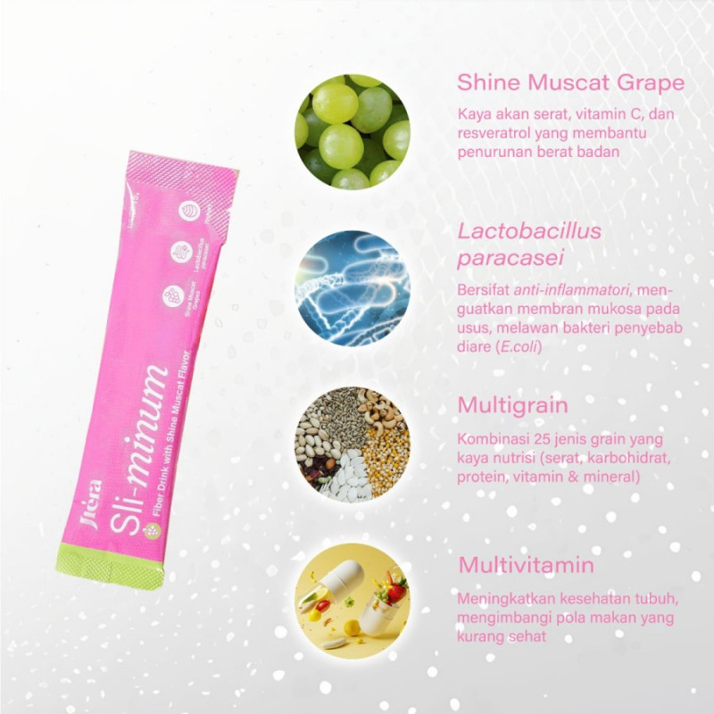 Sli-minum mengandung 10 kandungan yang berfokus untuk menjaga kesehatan pencernaan dan #BenerinUsusmu meliputi serat, probiotik, prebiotik, multigrain, dan multivitamin. Diformulasi tanpa kandungan bahan zat aktif sennoside atau pencahar Sli-minum dapat membantu proses detoksifika-si tubuh dan meredakan sembelit tanpa rasa melilit.