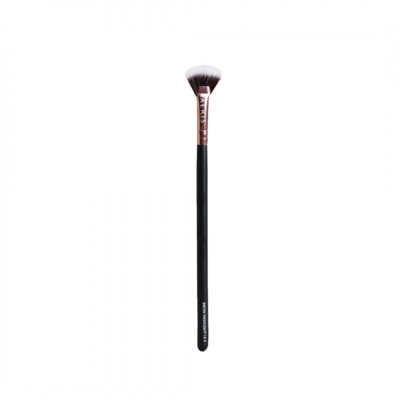 A tiny fan brush with a graceful sweep. This brush is perfect for building up highlighters from a subtle to a full impact glow.