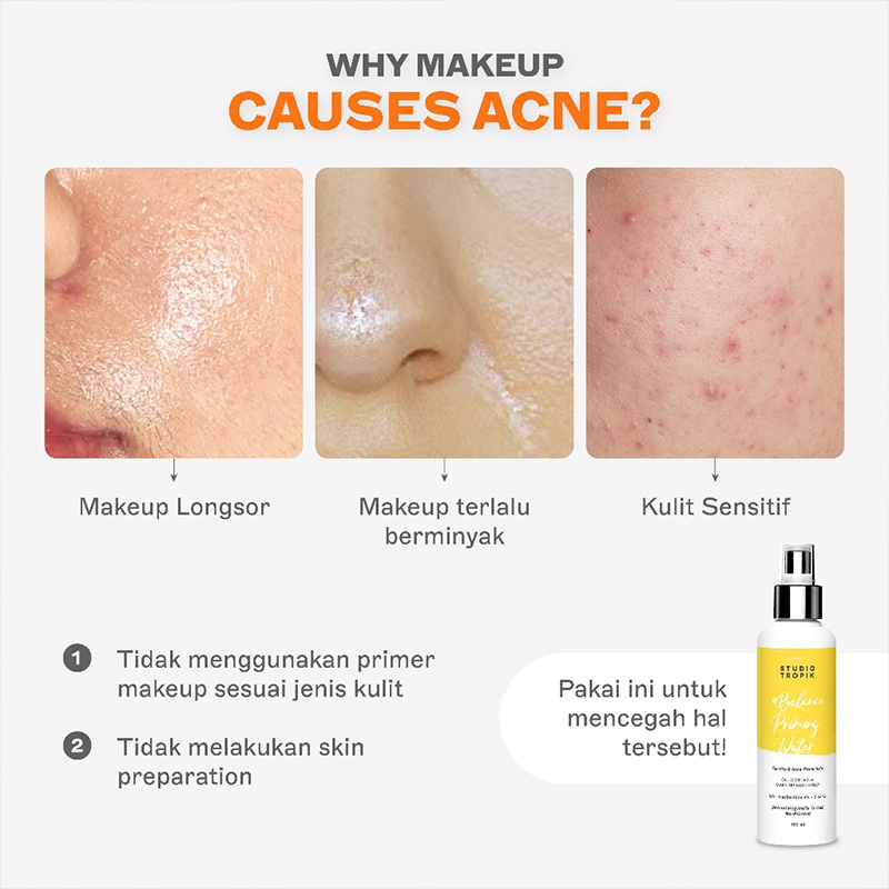 Studio Tropik #Balance Priming Water mengontrol minyak berlebih dan memberikan kesan wajah tampak “matte” dan halus. Mengandung formula Niacinamide dan Zinc yang mengembalikan keseimbangan kulit berjerawat.Dapat digunakan sebelum dan sesudah make-up.