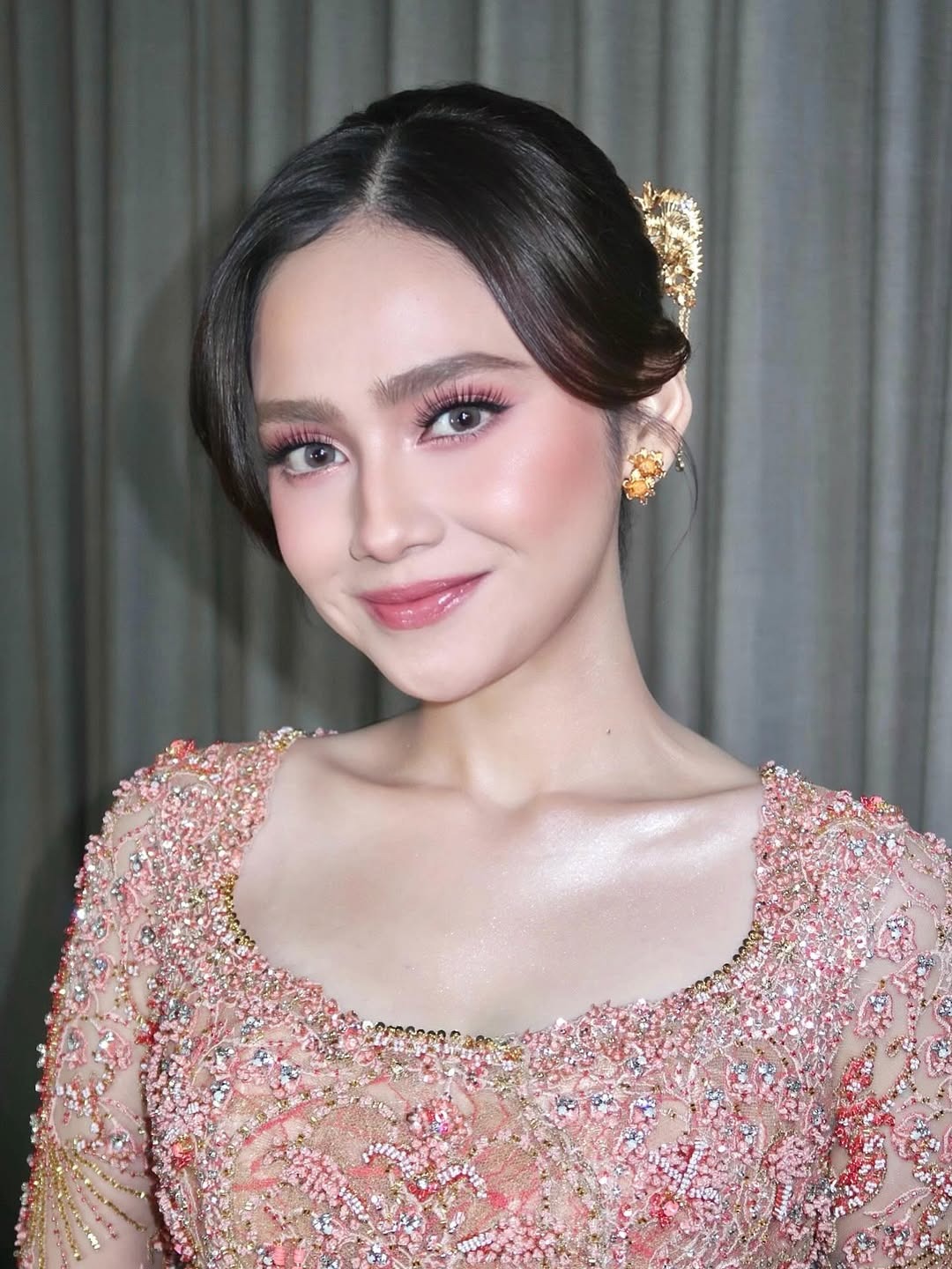 Lanjut, giliran tangan dingin Bennu Sorumba yang taking over the Akad Nikah. Mengambil adat Jawa, Syifa terlihat mengenakan paes di bagian kepalanya. It goes so well dengan riasan Bennu yang glam, lengkap dengan riasan mata yang kelihatan dramatis berkat pemakaian bulu mata berlapis, ditambah smokey eye plus eyeliner tegas, bikin area mata Syifa jadi makin hidup!
