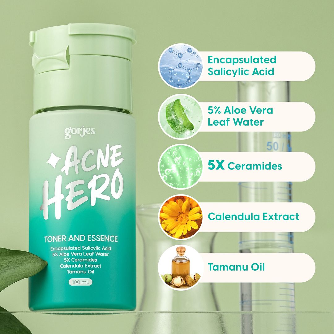 Sesuai dengan namanya, produk yang satu ini punya fungsi ganda, yaitu sebagai toner sekaligus essence, jadi bisa kamu gunakan setelah membersihkan wajah. Formula Gorjes Acne Hero Toner Treatment Essence diperkaya dengan 5x ceramide dan 5% aloe vera, yang diklaim efektif untuk menenangkan kulit yang mengalami kemerahan akibat jerawat.