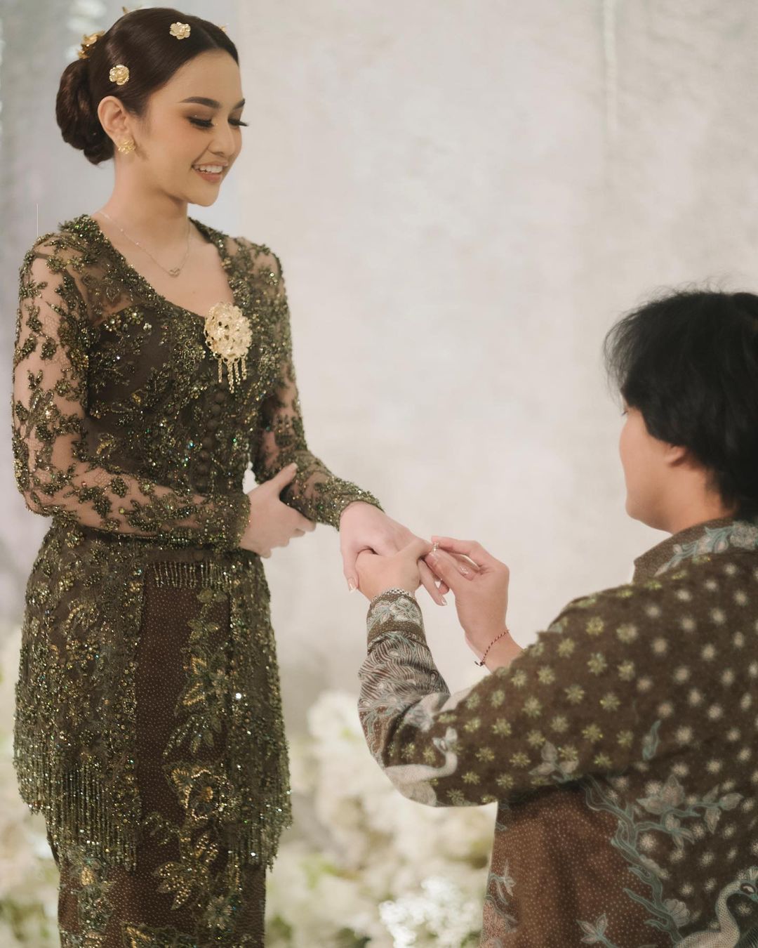 Mahalini memilih kebaya rancangan Asky Febrianti berwarna dark olive green. Ternyata pilihan warnanya ini bikin kulit Mahalini jadi kelihatan lebih cerah lho!