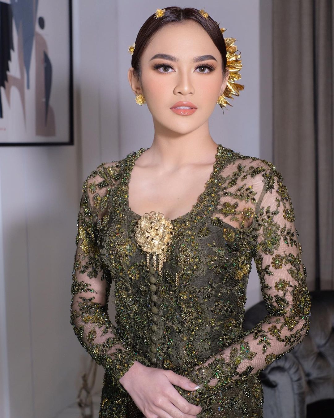 Dengan tampilan hair-do cepol ke belakang dan dengan tampilan poni yang rata tengah, Mahalini menambahkan headpiece dengan aksen bunga warna emas khas daerah Bali.