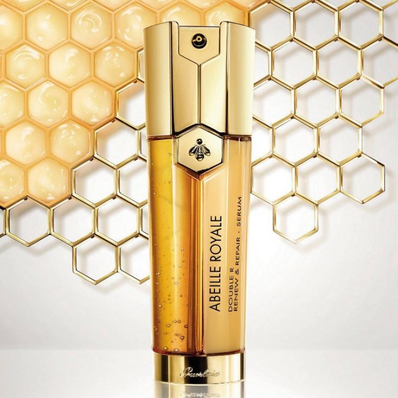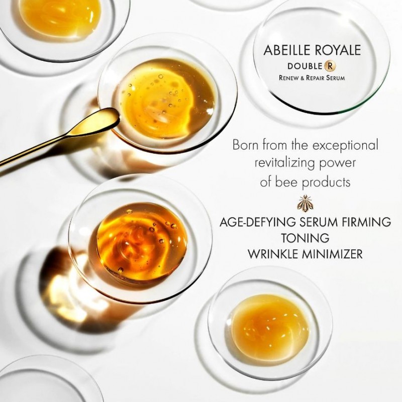 Guerlain’s Double R Renew & Repair serum combines the ultimate anti-ageing corrective technology from Abeille Royale with a soft-peel treatment for highly effective action on the visible signs of ageing: loss of skin elasticity and firmness, wrinkles, dull skin, imperfections, large pores.