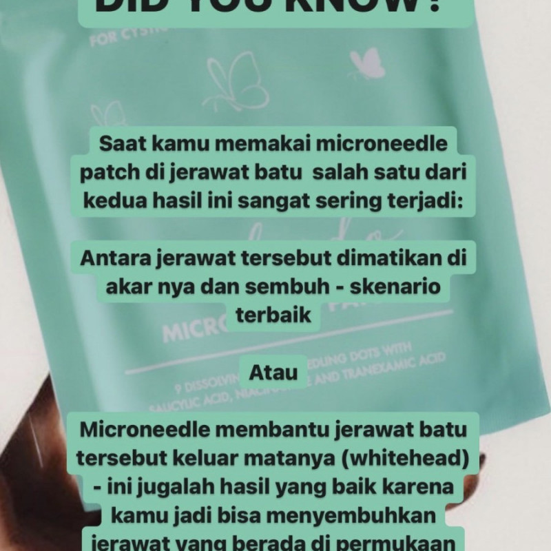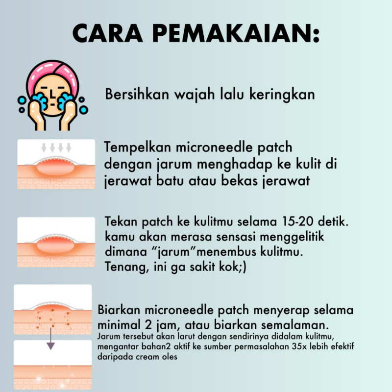 Cara pemakaian: 1. Setelah mencuci muka, tempelkan dot dengan tekstur menghadap kekulit di area jerawat batu/ bekas jerawat yang ingin diobati 2. tekan patch kearah kulit selama 15-20 detik. kamu akan merasakan sedikit sensasi geli 3. pakai selama 6-8 jam atau semalaman