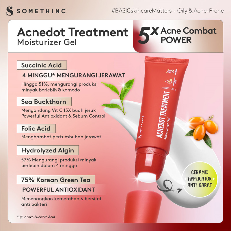 4. Pada tahapan terakhir, gunakan moisturizer Somethinc ACNEDOT Treatment Moisturizer Gel ke seluruh wajah & leher. (Gunakan roller pijat dengan gerakan memutar untuk ukuran 50ml, hindari memijat pada area dengan jerawat aktif).