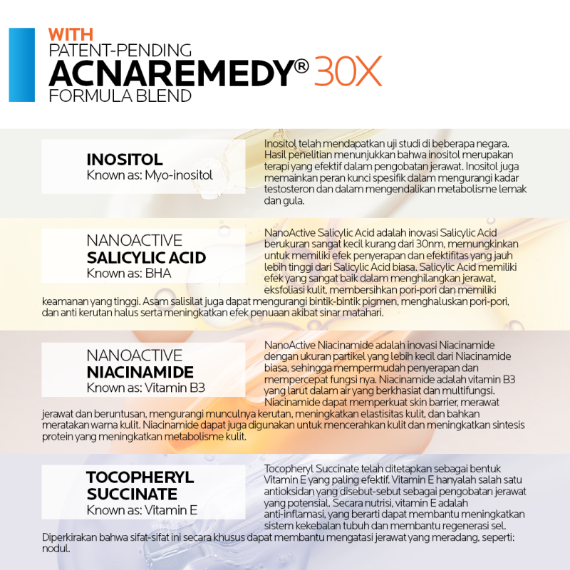 1. NanoActive Salicylic Acid : Inovasi Salicylic Acid berukuran sangat kecil kurang dari 30nm, memungkinkan untuk memiliki efek penyerapan dan efektifitas yang jauh lebih tinggi dari Salicylic Acid biasa. Salicylic Acid memiliki efek yang sangat baik dalam menghilangkan jerawat, eksfoliasi kulit, membersihkan pori-pori dan memiliki keamanan yang tinggi.