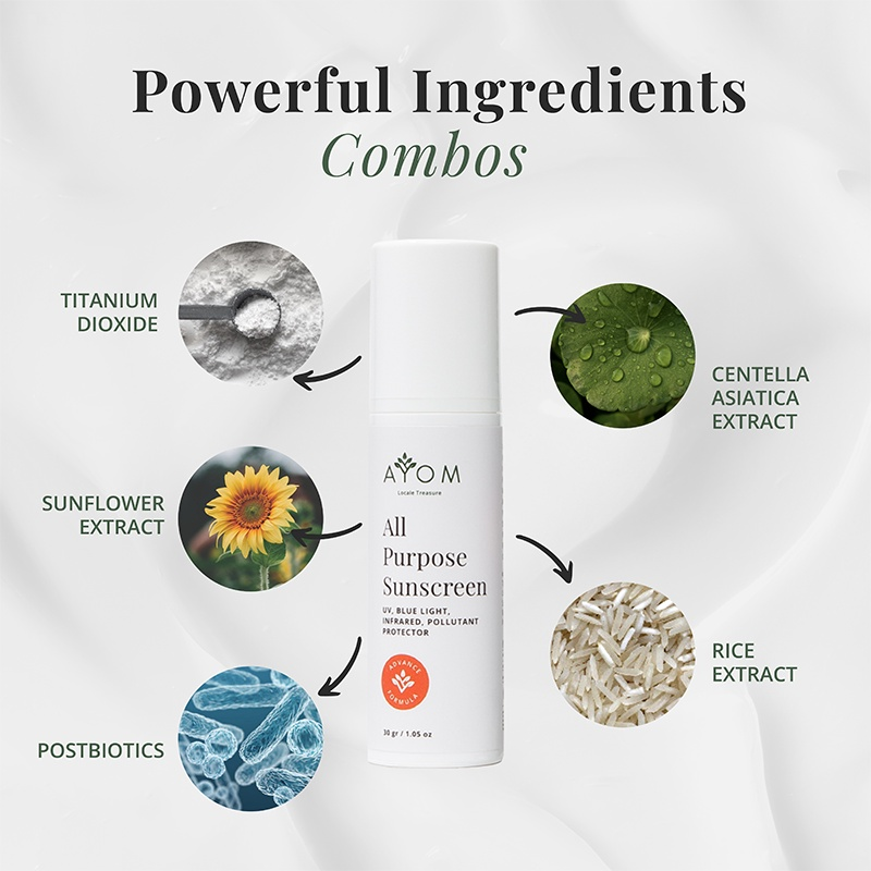 AYOM All Purpose Sunscreen adalah daily broad-spectrum sunscreen yang tidak lengket, efektif melindungi kulit dari kerusakan akibat panas, radiasi UVA, UVB, blue light, infrared dan polusi.