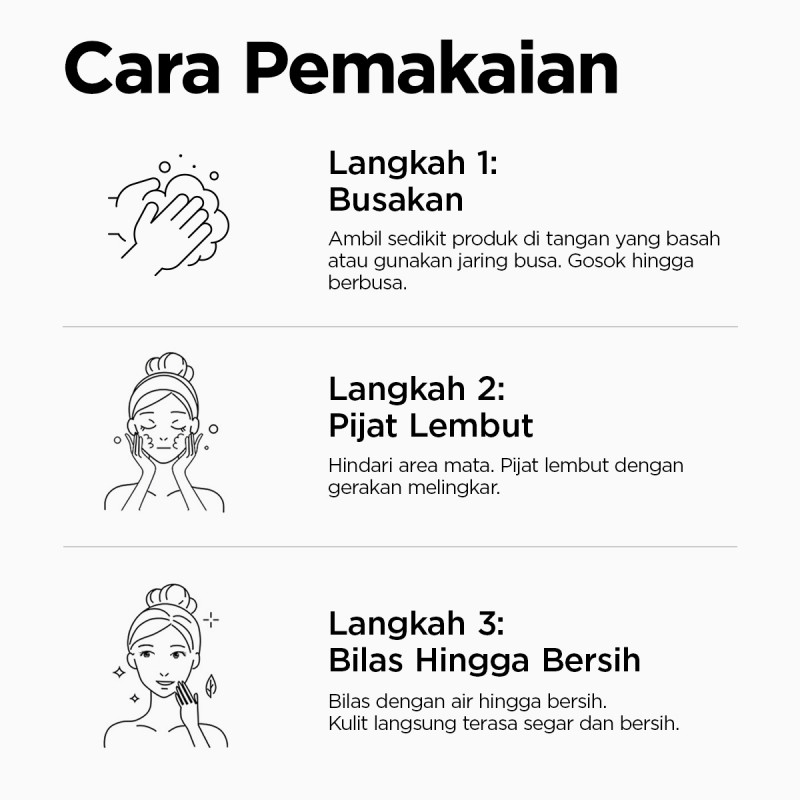 Step 1 : Ambil secukupnya di telapak tangan basah atau nett foam, gosok hingga berbusa Step 2 : Hindari area mata, pijat lembut seluruh wajah dengan gerakan melingkar Step 3 : Bilas dengan air bersih atau hangat, kulit langsung terasa segar dan cerah