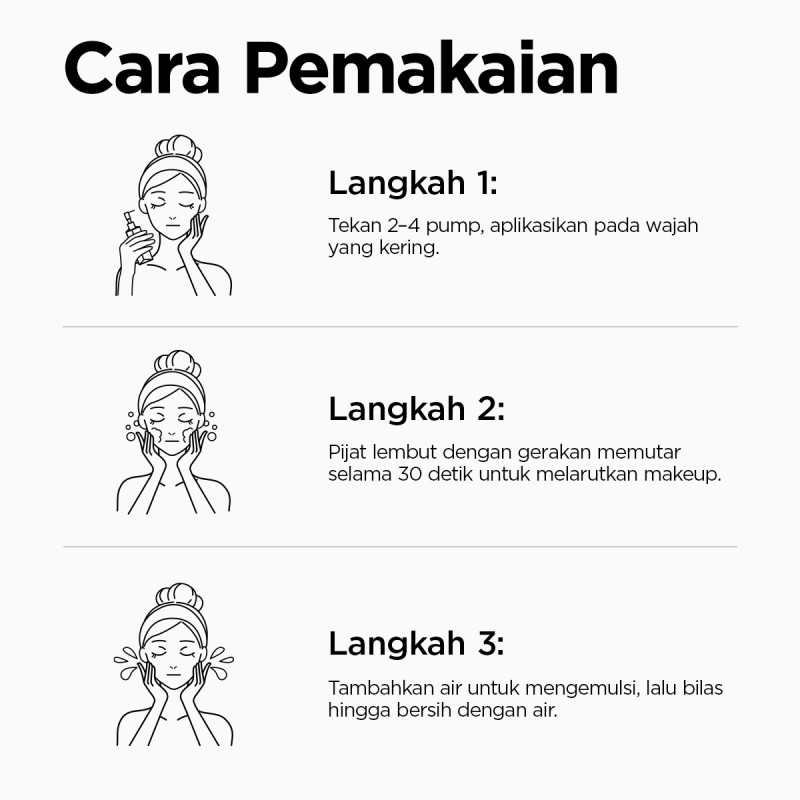 Step 1 : Gunakan tangan dan wajah dalam keadaan kering. Ambil 2-4 pump cleansing oil dan ratakan ke seluruh wajah. Step 2 : Pijat lembut dengan gerakan memutar mengikuti arah tekstur kulit selama ±30 detik hingga makeup larut. Step 3 : Tambahkan sedikit air untuk emulsifikasi, lalu bilas bersih dengan air mengalir.