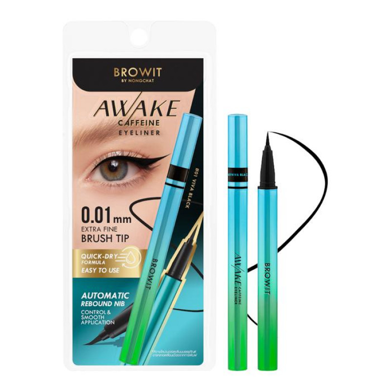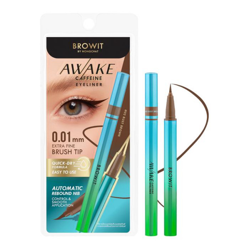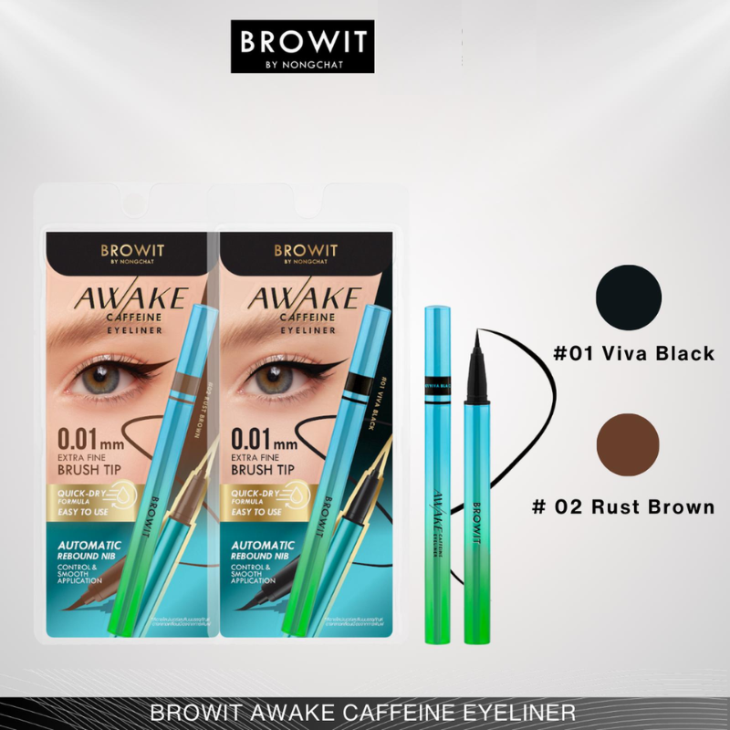 BROWIT Awake Caffeine Eyeliner, Dengan ujung kuas sehalus 0,01 mm, eyeliner ini menciptakan tampilan mata yang berani dan terjaga dengan presisi dan mudah. Mengubah mata yang mengantuk menjadi tampilan yang memukau dan tajam dengan pigmen yang kaya dan tahan lama, meluncur mulus tanpa terputus. Tahan air dan keringat, eyeliner ini memberikan hasil warna intens yang tahan sepanjang hari. Diperkaya dengan Kafein dan Palmitoyl Hexapeptide-12, eyeliner ini menutrisi kulit halus di sepanjang garis bulu mata, menjaganya tetap halus, dan membantu menunda munculnya garis-garis halus.