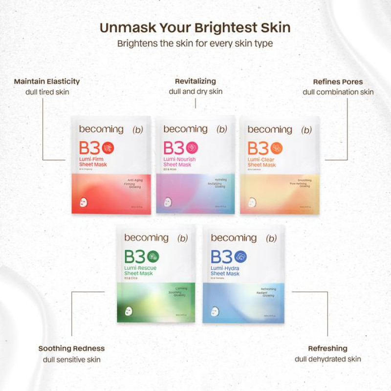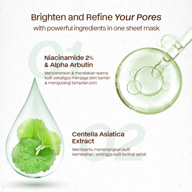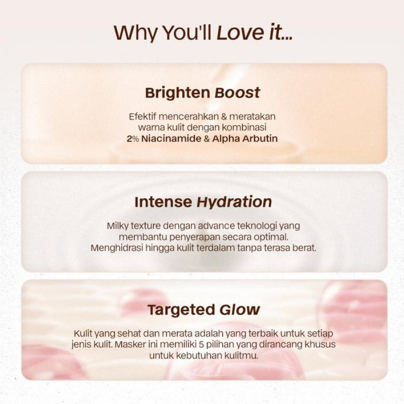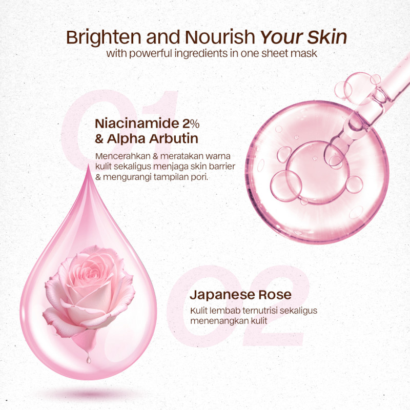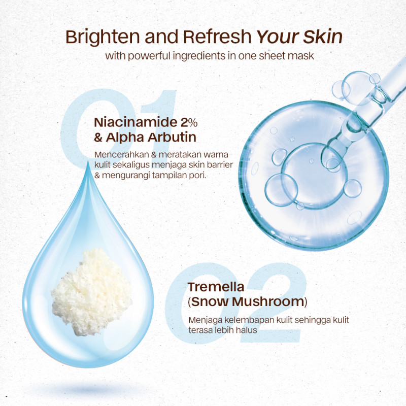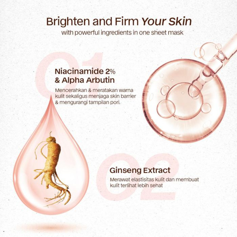 Sheet mask / masker wajah yang dapat membantu mencerahkan dan mengembalikan tampilan kulit sehat bercahaya.