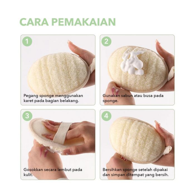 Cara Pemakaian : Pegang sponge menggunakan karet pada bagian belakang, Gunakan sabun atau busa pada sponge, Gosokkan secara lembut pada kulit, Bersihkan sponge setelah dipakai dan simpan di tempat yang bersih