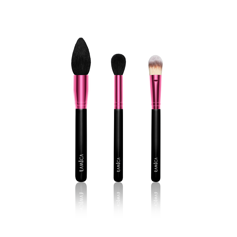 The basic makeup brush trio for your face. You can fundamentally have these three and finish up your face makeup. Have fun putting on your foundation, blush on and highlighter!