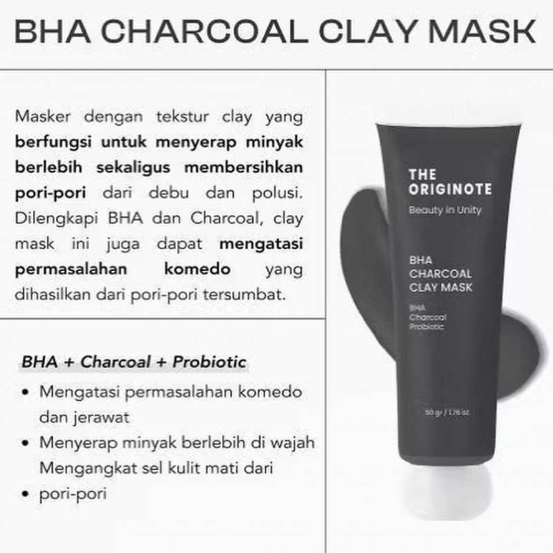 The Originote BHA Charcoal Clay Mask diformulasikan dengan Bamboo Charcoal dan BHA yang membantu mengontrol minyak, merawat komedo dan jerawat pada wajah, membantu mengangkat kulit mati, dan membantu membersihkan kulit agar kulit tampak lebih cerah.