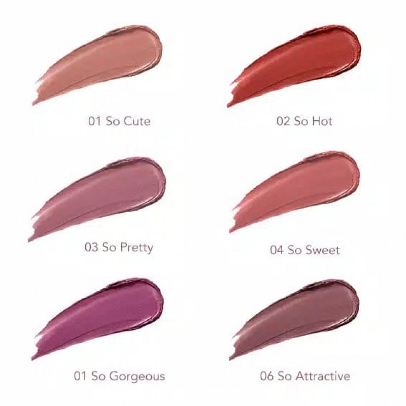 Dengan tekstur yang melembabkan, ‘Blushing My Lips’ memberikan finishing yang Glossy. Produk ini tersedia dalam 6 warna yang bisa tahan lama, tetap membuat bibir terasa lembut. Variasi : 01 So Cute 02 So Hot 03 So Pretty 04 So Sweet 05 So Gorgeous 06 So Attractive