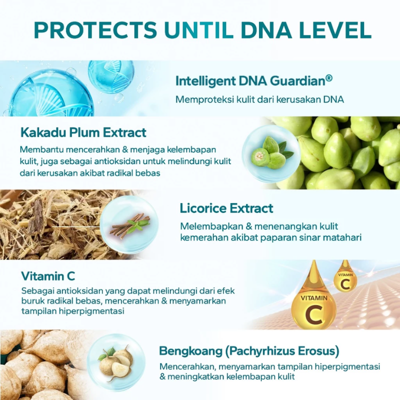 Diformulasikan dengan Intelligent DNA Guardian庐, dengan perlindungan 7-in-1 terhadap: UVA, UVB, Blue Light, Polusi, Radikal Bebas, Penuaan, dan Kerusakan DNA*