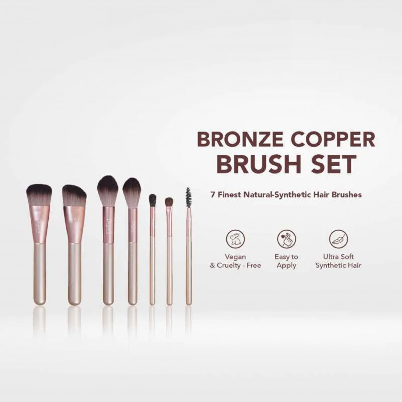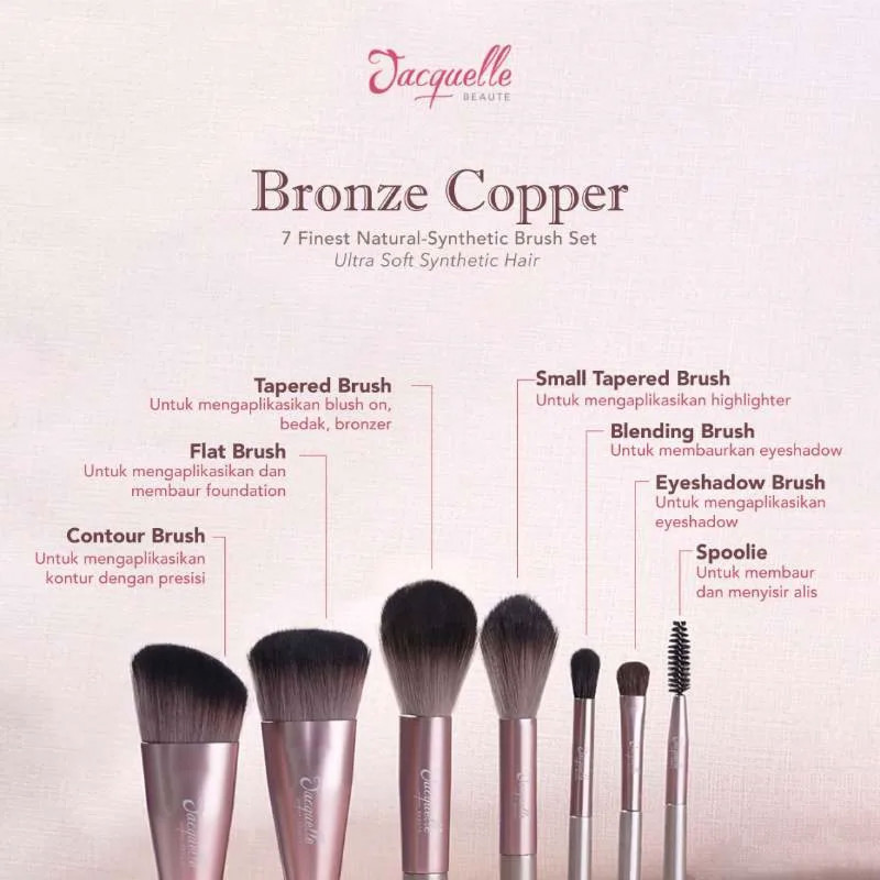 Jacquelle Bronze Copper terdiri dari 7 Sikat Rambut Sintetis Alami Terbaik. Alat yang sempurna untuk presisi