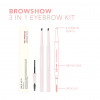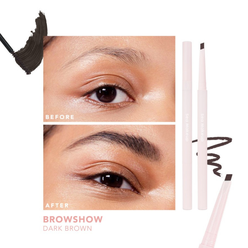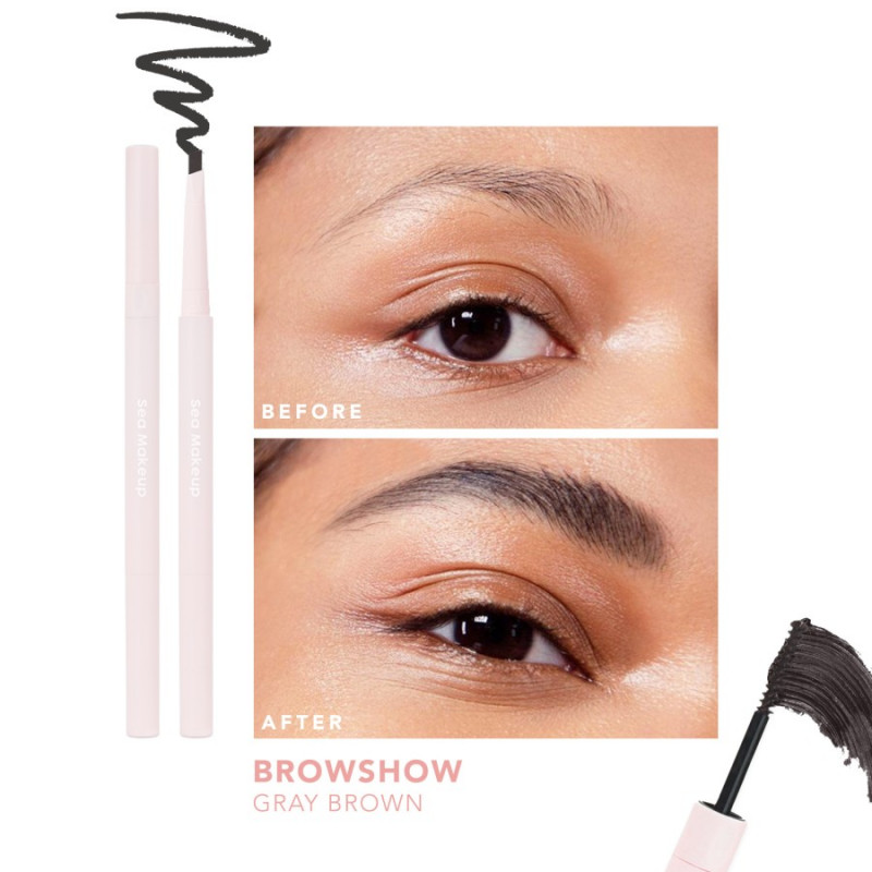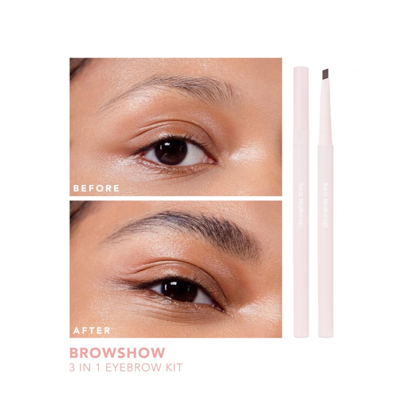 SEA Makeup Browshow Eyebrow Trio Kit merupakan produk yang dirancang khusus untuk berbagai kebutuhan alis dan dikemas dalam satu buah produk, dilengkapi dengan pensil alis berbentuk segitiga yang pipih, dengan pigmentasi yang creamy, pigmented namun tetap blendable, serta spoolie untuk menyikat rambut-rambut alis, dan juga browcara yang dapat berfungsi untuk mengunci serta memberi ketahanan yang lebih lama pada bentuk alis yang telah digambar dan dibentuk.