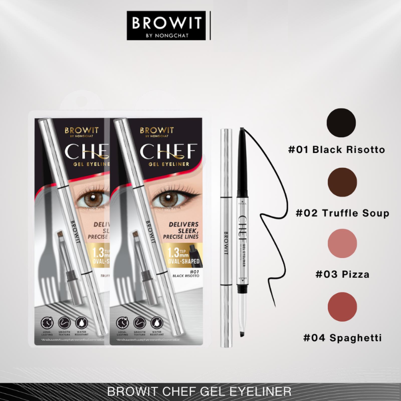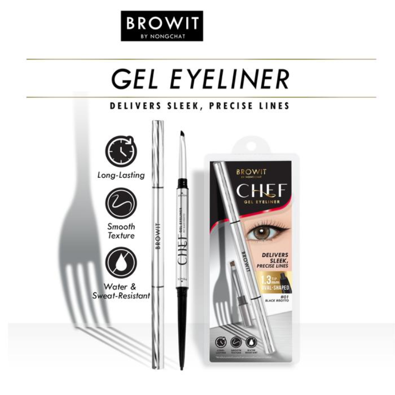 BROWIT Chef Gel Eyeliner, Eyeliner gel ini mempertegas mata Anda dengan garis-garis ramping dan memanjang. Dengan ujung oval presisi selebar 1,3 mm, eyeliner ini memungkinkan pengaplikasian yang halus dan terkontrol. Teksturnya yang selembut beludru meluncur dengan mudah, menghasilkan pigmen yang kaya dan intens yang tahan lama—tahan air dan keringat. Kuas bersudut yang menyertainya menyempurnakan eyeliner bersayap dengan hasil akhir yang tajam dan mulus. Diperkaya dengan ekstrak premium seperti Minyak Zaitun dan Minyak Rosemary, eyeliner ini melembapkan dan menenangkan area mata yang sensitif.