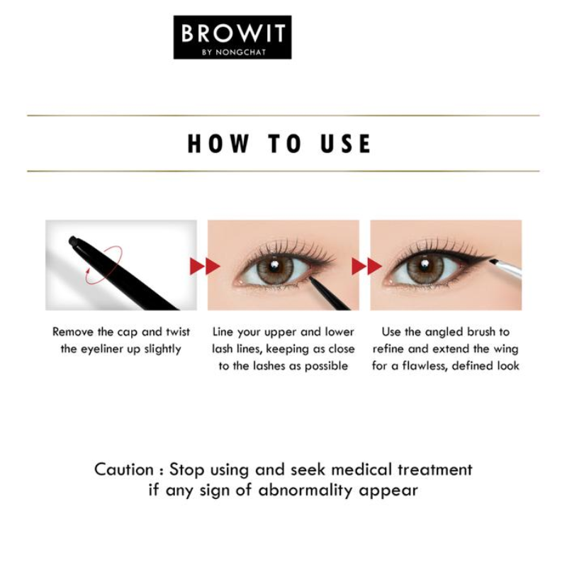 How To Use : Pull to open the cap, twist the eyeliner up slightly, then draw the eyeliner along the upper and lower lash line as close as possible, and use the winged brush to make it longer and smoother.