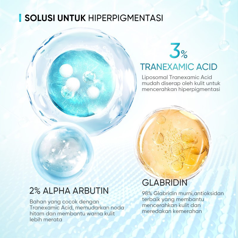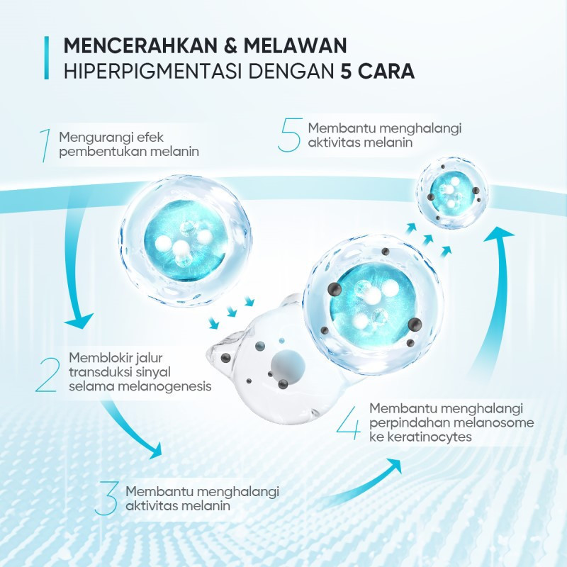 Serum dengan tekstur ringan, bekerja sebagai booster untuk membantu mencegah pembentukan melanin. Membantu memudarkan noda hitam dan mengandung antioksidan untuk kulit cerah dan skin barrier terjaga.