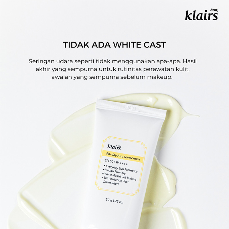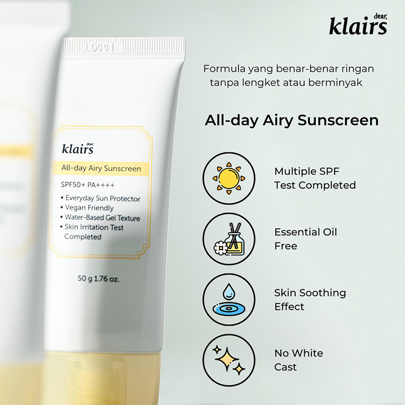 All-Day Airy Sunscreen adalah tabir surya pelembab dengan SPF 50+ PA++++ yang melindungi kulit Anda dari tajamnya Sinar UV tanpa white cast. Teksturnya yang ringan dan hasil akhir yang menyegarkan membuat kulit Anda tidak berminyak. Sunscreen ini diformulasikan dengan bahan-bahan yang ringan, tabir surya ini cocok untuk semua jenis kulit dan tidak membuat kulit iritasi. Dikembangkan dengan teknologi intensif dan canggih agar aman dan nyaman di kulit Anda. Direkomendasikan untuk digunakan setiap hari sebagai langkah terakhir dari rutinitas perawatan kulit Anda.