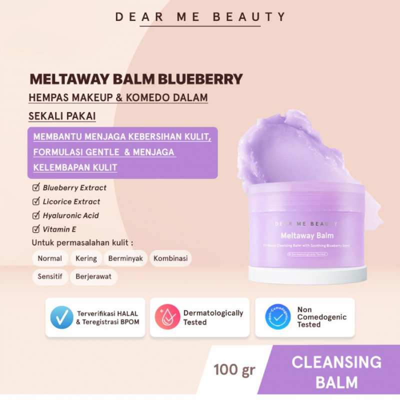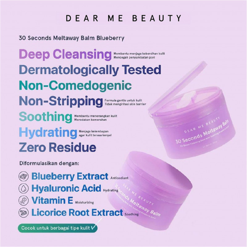 Pembersih wajah bertekstur balm dengan pH-balanced yang mampu membersihkan kotoran, residu sunscreen, dan makeup dengan maksimal cukup dalam 30 detik. Mengandung Blueberry Extract, Hyaluronic Acid, Vitamin E, dan Licorice Root Extract yang mampu memberikan hidrasi dan kelembapan kulit sehingga tidak terasa kering setelah dibersihkan.