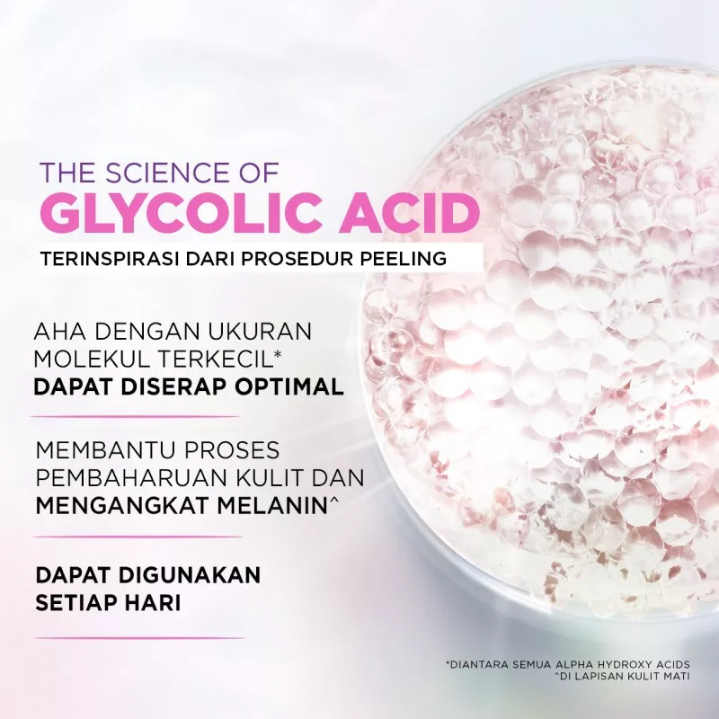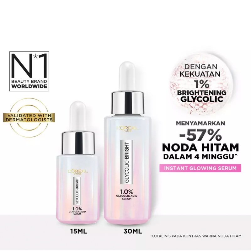 Glycolic Bright Instant Glowing Face Serum dengan konsentrasi optimal 1% Brightening Glycolic Acid, menyamarkan -57% noda hitam, dan mencerahkan untuk kulit tampak glowing lebih merata. Diuji oleh ahli kulit dan terbukti pada kulit Asia.